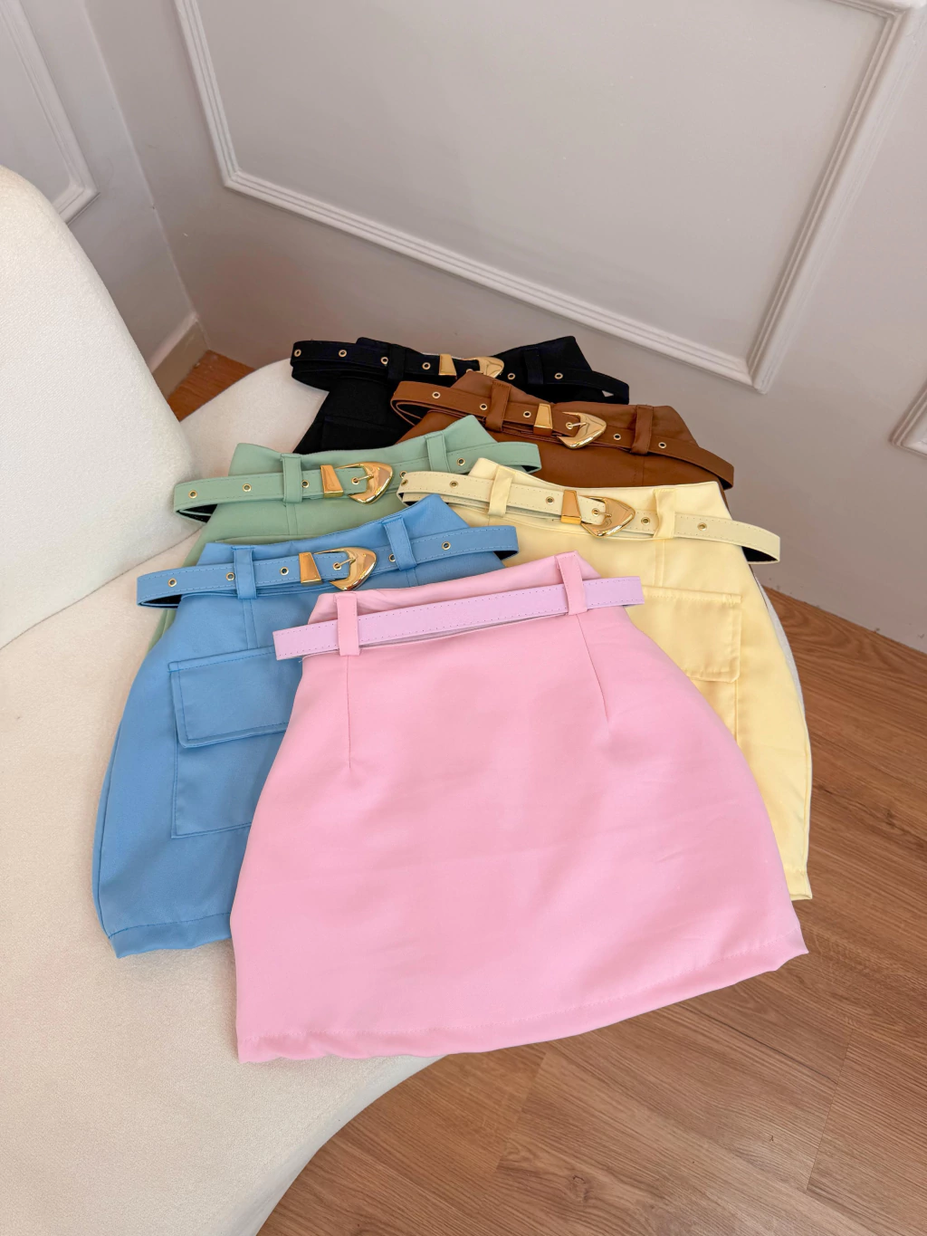 Short saia em tecido de alfaiataria encorpado, moderno e funcional, com acabamento refinado.